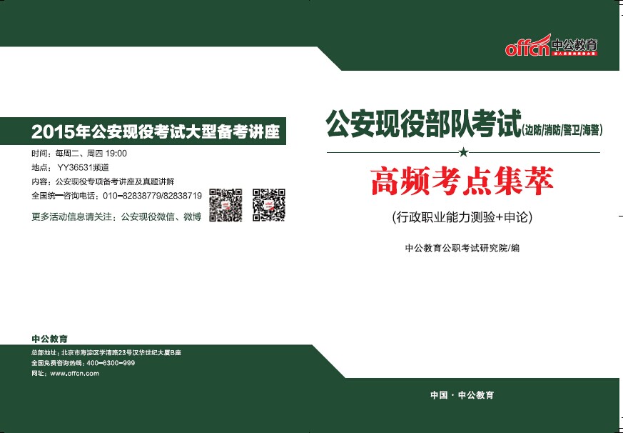 公安现役重磅超值图书《公安现役部队考试(边防/消防/警卫/海警)高频考点集萃 行测+申论》新鲜出炉啦!高频考点细致梳理,解题技巧深入精讲,堪称公安现役考试的豪华大餐!现在你只需要拿起电话,拨打我们的客服热线预约,或直接到济南分部领取,就能免费品尝!