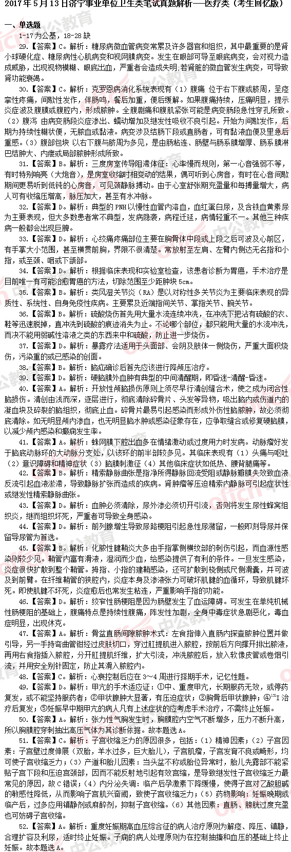 2017年5月13日济宁事业单位卫生类笔试真题解析---医疗类(考生回忆版)