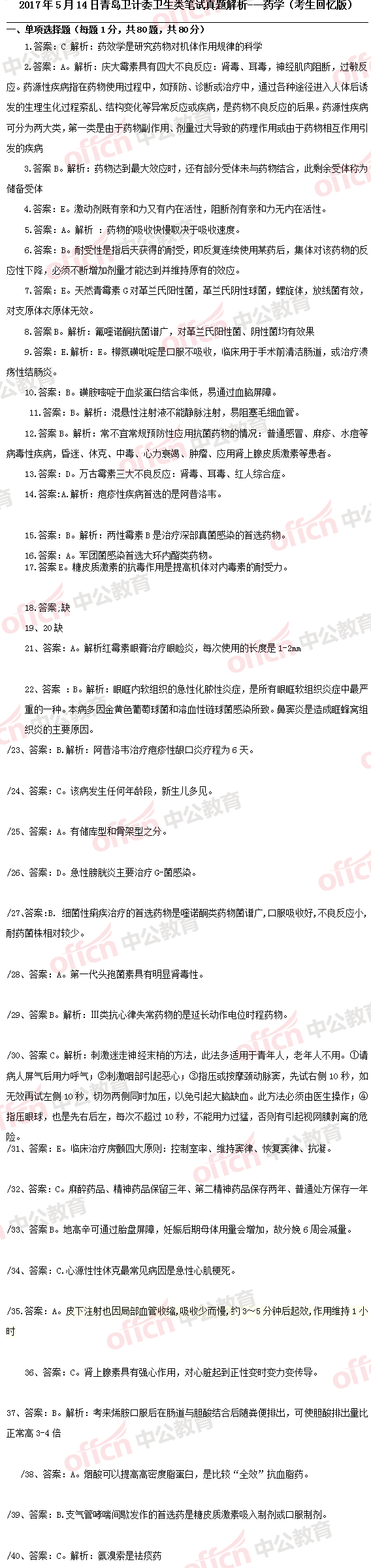 2017年5月14日青岛卫计委笔试真题答案解析---药学类(考生回忆版)