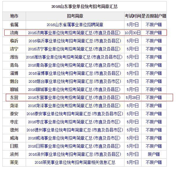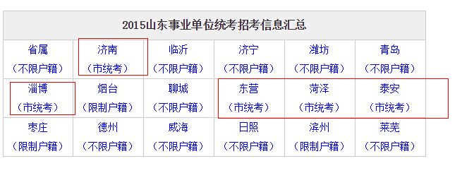 2、根据山东中公教育整理的2016年山东事业单位统考专题,济南和东营未参加2016山东事业单位统考,泰安只有市直参加了统考。