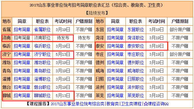 3、2017年未参加山东事业单位统考的地市有济南、济宁、聊城以及泰安市直外的各区县,详情可查看>>>2017山东事业单位统考简章职位表汇总。