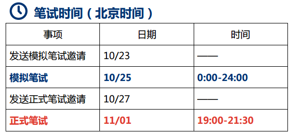 3. 正式笔试有严格的统一开考时间和截止时间,请根据收到的笔试通知,提前至少 30 分钟进入准备。
