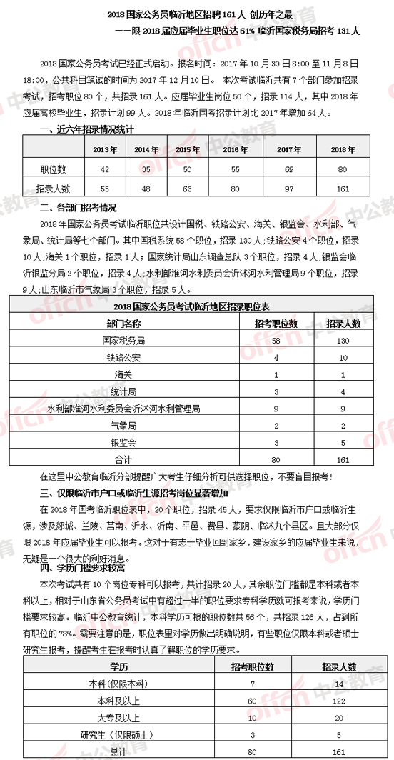 2018国考临沂地区招161人 创历年之最 限应届毕业生职位达61%