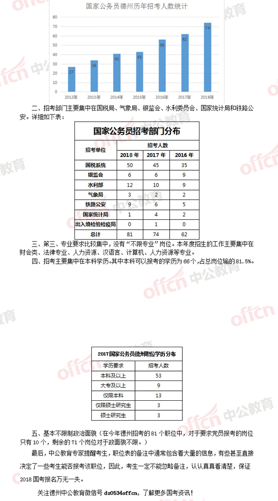 一、2018年国考德州市7个部门共招录81人,招录职位数42个,相比去年增加了7人。其中,国税职位22个,招50人;铁路公安局职位2个,招9人;国家统计局职位1个,招1人;山东省气象局职位3个,招3人;银监会职位3个,招6人;黄委会职位3个,招3人;海委会职位8个,招9人。