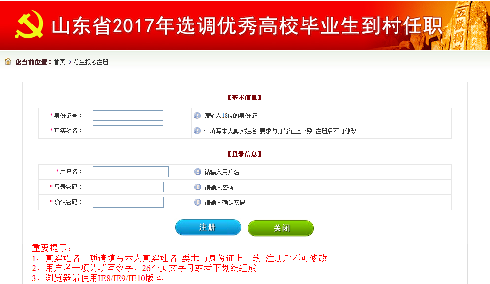 (1)注册报名系统用户。报考人员进入“山东高校毕业生就业信息网”,点击“山东省2017年选调优秀高校毕业生到村任职”通栏,进入报名系统,点击“考生报考系统入口”,用姓名、有效居民身份证号注册用户。
