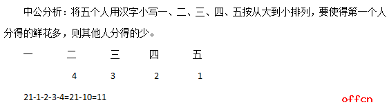 【例】:有21朵鲜花分给5个人,每人都分得鲜花且分得的数量各不相同,问分得鲜花最多的人最多分得几朵鲜花?