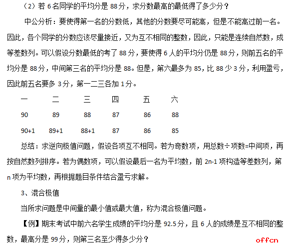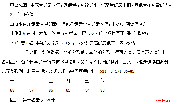 首先,拿到一个题目,如何来判断一个题目是否属于和定极值问题,我们需要按以下两个条件去排除:①几个数的和一定;②问题是求其中某个量的最大值或者最小值。比如:8名学生参加某项竞赛,共得131分。已知每人的得分是互不相同的整数,且最高分是21分,则最低分最高是多少分?在这题中,8个人的得分之和一定,满足了条件①。问题是求其中考最低分的学生的得分最多是多少,满足了条件②。因此是和定极值问题。又比如:若两个自然数的积为100,求这两个自然数和的最小值。在这题中,已知两数的积,而不是和,不满足条件①。问题所求是和,而不是其中某项,不满足条件②。因此不是和定极值问题。