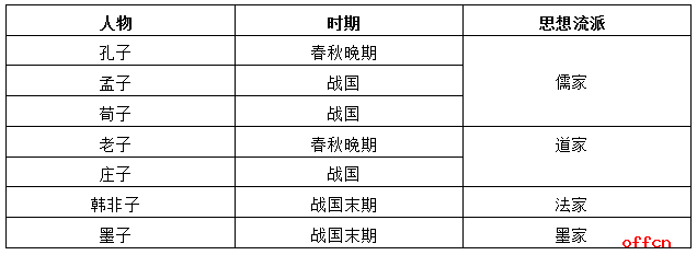 春秋战国时期,学术思想空前发达。当时学派很多,主要学派有:儒家、道家、法家、墨家、名家、阴阳家、纵横家、杂家、农家和小说家,这些并称为“十家”。由于小说家没有系统的理论,不能称其为一个学派,其他的九家又被称为“九流”。其中,儒家、道家、法家和墨家对当时和后世的影响较为深远。而各类公职考试也比较热衷于考察这四大家的代表人物及其思想,下面我们就先简单了解下这些“XX子”们: