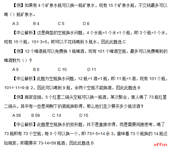 在很多省份会考到统筹问题,其中空瓶换水就属于其中的一种,它是基于生活的考虑,生活中有一些规则,比如几个空瓶可以换得一瓶水,那通过已知已有的空瓶数,求解可以喝到多少瓶水,这就属于空瓶换水问题。