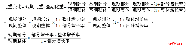 这种类型的题目一般会告诉我们整体现期值,整体较上一年的增长率,部分现期值及部分较上一年的增长率,然后让我们比较一下这个部分所占整体比重是今年大,还是去年大。想要快速解答,就必须对比重变化的公式有足够了解: