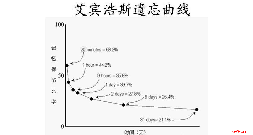 德国心理学家艾宾浩斯研究发现,遗忘在学习之后立即开始,而且遗忘的进程并不是均匀的。最初遗忘速度很快,以后逐渐缓慢。他认为“保持和遗忘是时间的函数”,他用无意义音节(由若干音节字母组成、能够读出、但无内容意义即不是词的音节)作记忆材料,用节省法计算保持和遗忘的数量。并根据他的实验结果绘成描述遗忘进程的曲线,即著名的艾宾浩斯记忆遗忘曲线。