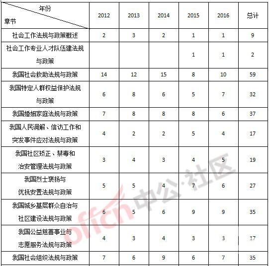 总的来看,各章节考点在近五年的真题中数量波动较大,各章近五年真题的考点总量呈现明显的梯度变化:我国社会救助法规与政策考点最多,考了近60道;其次我国社会保险法规与政策和我国劳动就业和劳动关系法规与政策考点在40~50道之间;其次为我国特定人群权益保护法规与政策,我国婚姻家庭法规与政策,我国城乡基层群众自治与社区建设法规与政策,我国社会组织法规与政策考点在30~40道之间,再其次为我国人民调解、信访工作和突发事件应对法规与政策,我国社区矫正、禁毒和治安管理法规与政策,我国烈士褒扬与优抚安置法规与政策,我国公益慈善事业与志愿服务法规与政策,我国健康与计划生育法规与政策,考点在10~30道之间;最后,社会工作法规与政策概述和社会工作专业人才队伍建设法规与政策考点最少,都在个位数,尤其是社会工作专业人才队伍建设法规与政策考只在近两年真题中考了2道。